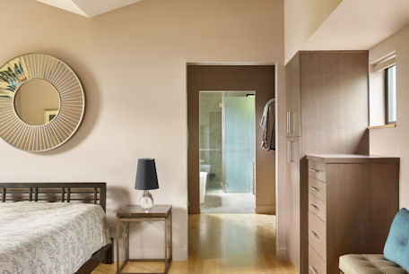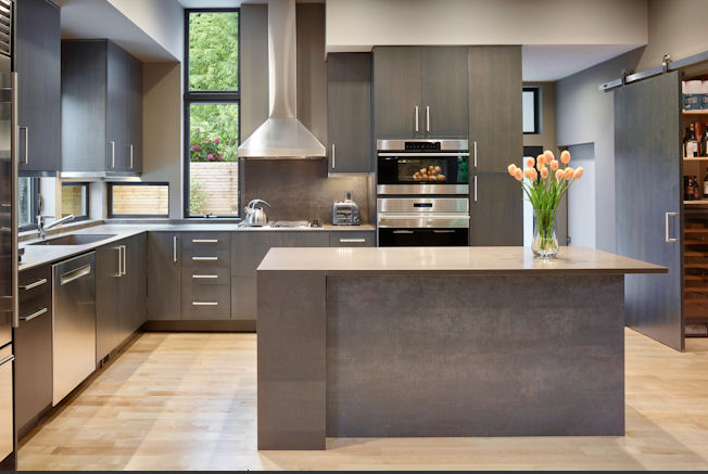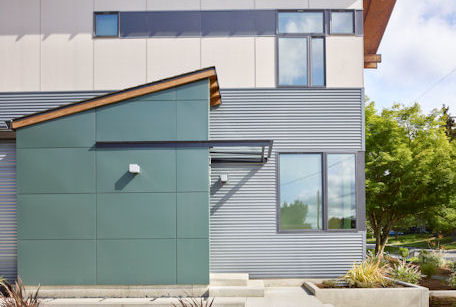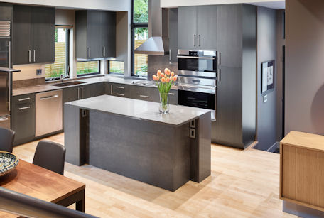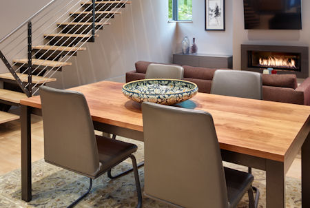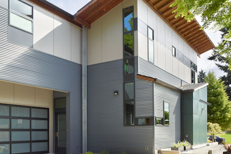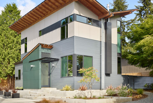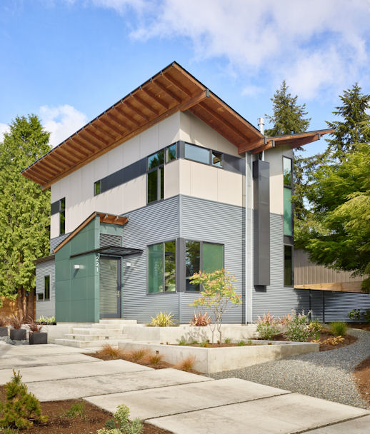 The Modest 1800 square foot scale of this home is a bit of a throw back to post war homes. However that’s about the only parallel that could be drawn. The sculptured butterfly roof form that’s projected to the interior definitely states it’s a home of our time.The square footage belies its free flowing interior special quality, modern in all aspects while quietly responding to the proven essentials for habitation and refuge. The energy efficient two story two bedroom home at the owners request has the kitchen as the functional and aesthetic heart. The material palette and assemble of details were selected both for low maintenance and artistic potential.