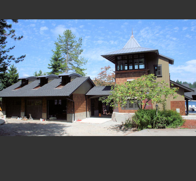 The Owner of this one story waterfront home required a new office space and garage. The most logical spot for the new office is on the driveway side. We elevated the office in the tower, allowing a pretty impressive panoramic view of the water and surrounding areas.